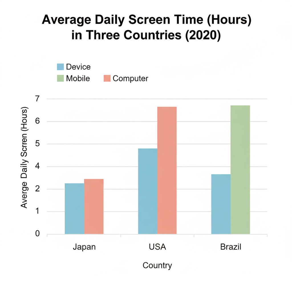• Brazil: mobile 6h (highest), computer 2h (lowest)