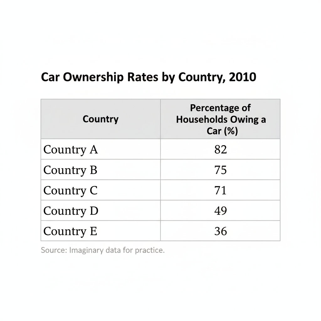 Example Task: The table below shows the percentage of households owning a car in five countries in 2010.