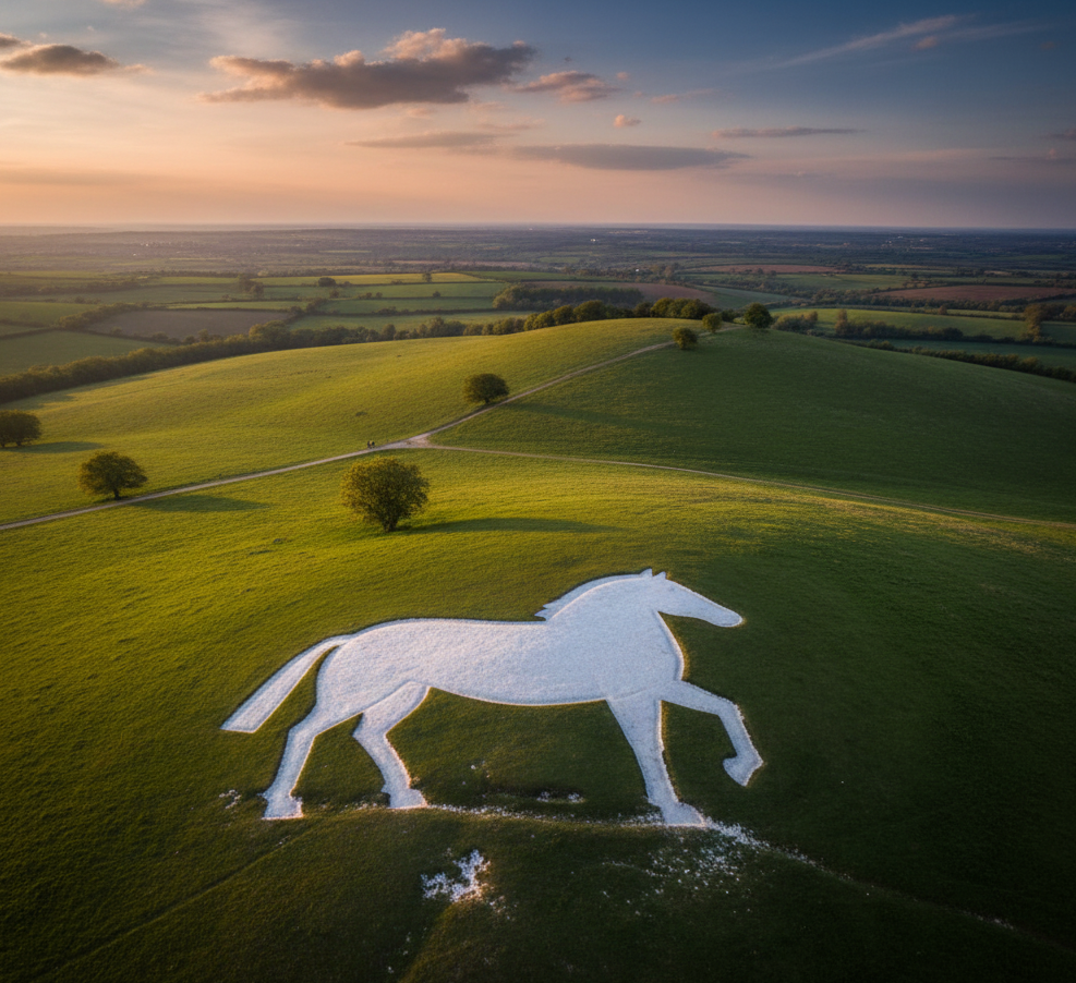 The Uffington White Horse is a unique, stylised representation of a horse consisting of a long, sleek back, thin disjointed legs, a streaming tail, and a bird-like beaked head. The elegant creature almost melts into the landscape. The horse is situated 2.5 km from Uffington village on a steep close to the Late Bronze Age* (c. 7th century BCE) hillfort of Uffington Castle and below the Ridgeway, a long-distance Neolithic** track.