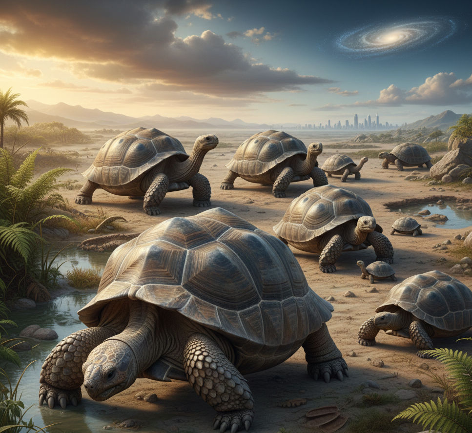Tortoises therefore represent a remarkable double return. In common with all mammals, reptiles and binds, their remote ancestors were marine fish and before that various more or less worm-like creatures stretching back, still in the sea, to the primeval bacteria. Later ancestors lived on land and stayed there for a very large number of generations. Later ancestors still evolved back into the water and became sea turtles. And finally, they returned yet again to the land as tortoises, some of which now live in the driest of deserts.