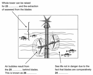 D A marine turbine blade needs to be only one third of the size of a wind generator to produce three times as much power. The blades will be about 20 metres in diameter, so around 30 metres of water is required. Unlike wind power, there are unlikely to be environmental objections. Fish and other creatures are thought unlikely to be at risk from the relatively slow-turning blades. Each turbine will be mounted on a tower which will connect to the national power supply grid via underwater cables. The towers will stick out of the water and be lit, to warn shipping, and also be designed to be lifted out of the water for maintenance and to clean seaweed from the blades.
