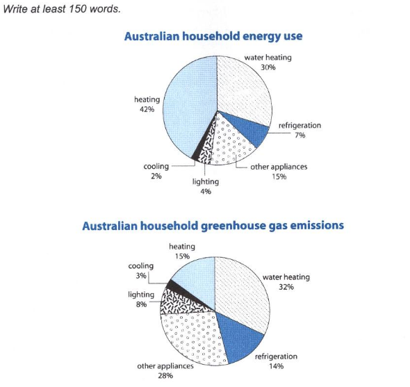 | The first chart below shows how energy is used in an average Australian household. The second chart shows the greenhouse gas emissions which result from this energy use. Summarise the information by selecting and reporting the main features, and make comparisons where relevant. |